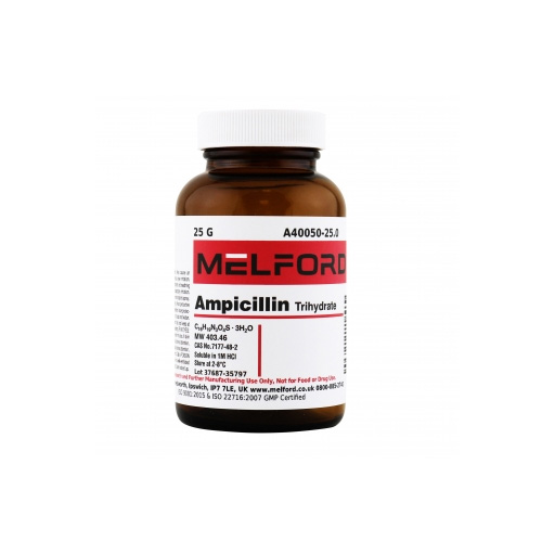 Ampicillin có dạng bột. Ampicillin là một kháng sinh phổ rộng có tác dụng tốt trên một số vi khuẩn Gram âm đường ruột. Ampicillin dùng trong ngành thủy sản, chăn nuôi…